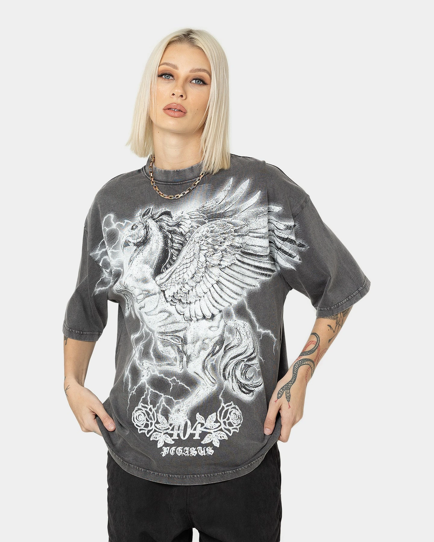 The Pegasus Vintage T-Shirt from 404 is defined by the pegasus motif to the front alongside 404 brandings, with a worn-in quality crafted by the intentionally cracked print. This piece offers luxury comfort and style for any occasion with its premium 240 GSM cotton construction, vintage wash, and twin-needle stitch.